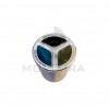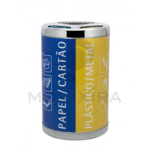 Ecoponto redondo totalmente em aço inox com corpo revestido a vinil laminado com 3 entradas de reciclagem seletiva.