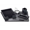 Conjunto de acessórios de secretária. Fabricádo em imitação de pele. Contém 6 acessórios: base dupla, abre cartas, suporte para bloco de notas, porta lápis, suporte para esferográficas e tabuleiro porta documentos.
